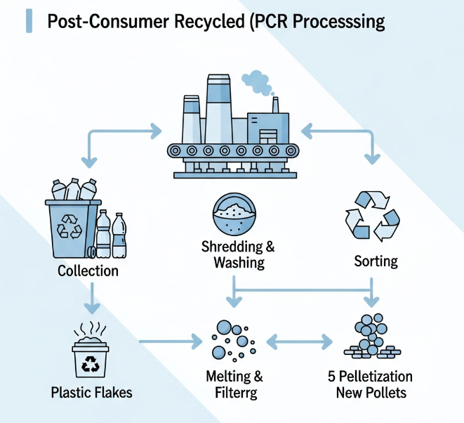 Määritelmä: PCR-materiaali on peräisin yksinomaan tuotteista, joita loppukuluttajat ovat käyttäneet, kerätty vakiintuneiden kierrätysohjelmien kautta ja jotka on ohjattu pois kaatopaikoilta tai valtameristä. Tämä sisältää päivittäisiä esineitä, kuten käytetyt muoviset vesipullot, jogurttipurkit, pesuainekannut ja alumiinitölkit.