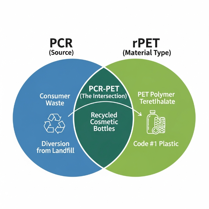 Ero PCR-kosmeettisen pullon ja rPET-kosmeettisen pullon välillä on laajuus ja alkuperä. Termi rPET on tekninen kuvaus muovin kemiallisesta identiteetistä, kun taas PCR on kultastandardi sen eettisen lähteen määrittämisessä.